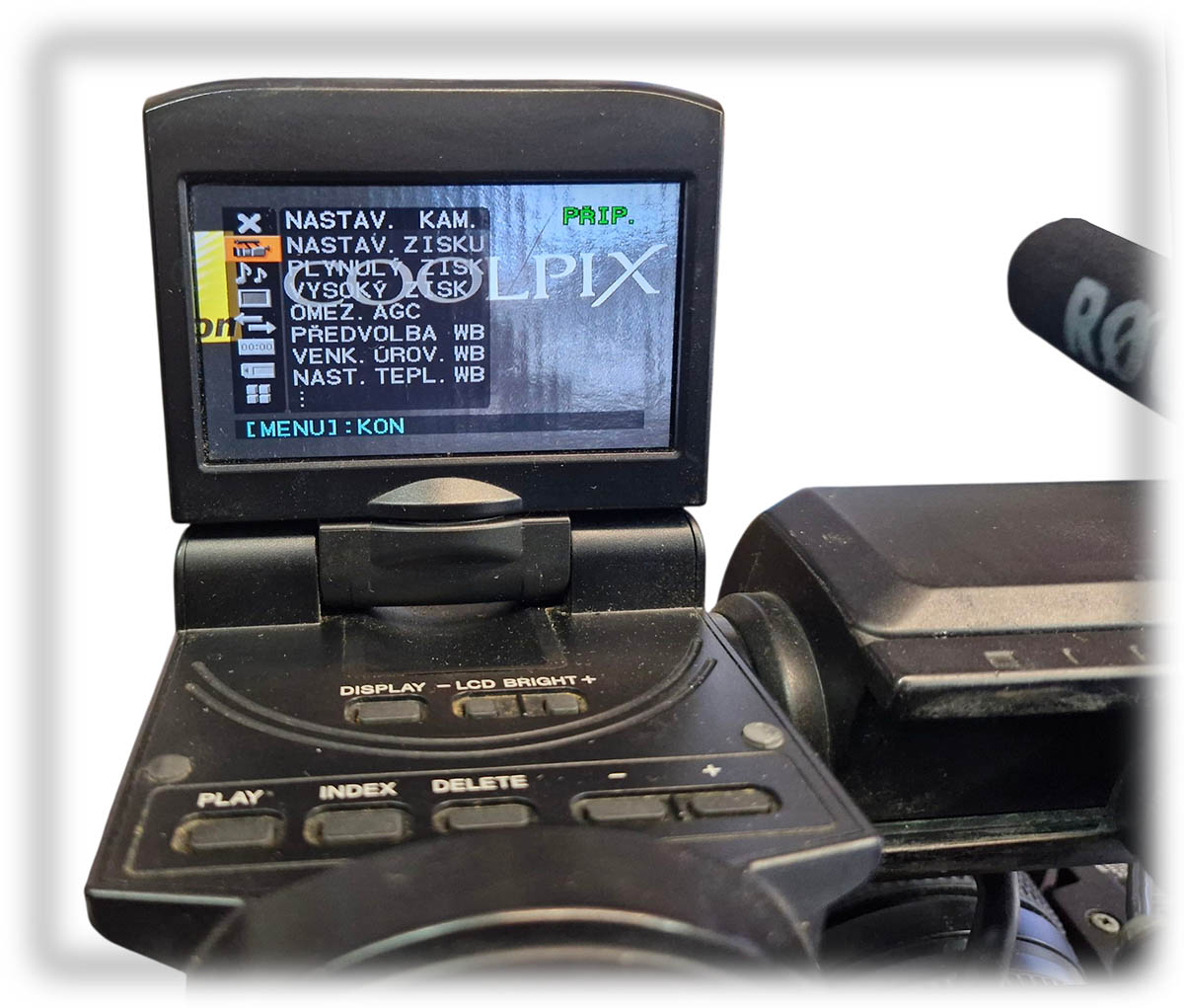 Sony HVR-S270F. OBRYNĚ na více velikostí a (záznamových formátů) DV-kazet. Pojďme se podrobněji projít po Sony HVR-S270F má v nabídce MENU komplet Češtinu!krásách IMPOZANTNÍ - velmi nekonfekční - VIDEOKAMERY SONY. Rozměry (Š x V x D, cca) 220 a 270 x 530 mm a hmotností 6,3kg (s obří baterií BP-GL95 (tu zmíním i dále) jde opravdu o pořádný STROJ. Při uchopení za madlo si kameraman uvědomí, že veškerá manipulace bude o posilovně. Pravda: VELMI pomáhá ramenní opěrka konstrukcí, která odlehčuje hmotu MAŠINY. Čtenář asi uvěří, že kamkoli si vejdu s takto „muskulaturní“ mašinou, vyvolávám údiv a obdiv, protože NEJVĚTŠÍ Kameraman (asi nejenom na venkově) je BOREC S tou NEJVĚTŠÍ strojovnou ze všech přítomných, to dá rozum - logicky… Mrkající